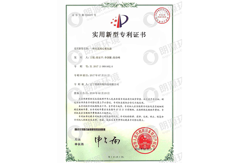 高速離心霧化器 專利證書