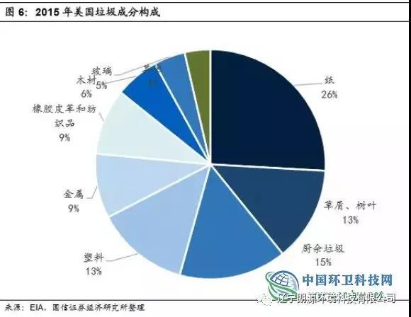 美國垃圾發(fā)電量占總發(fā)電量的0.4%。根據(jù)美國能源信息署統(tǒng)計,2015年,美國通過垃圾焚燒發(fā)電廠的發(fā)電量占總發(fā)電量約0.4%。美國垃圾成分由兩部分構(gòu)成:一是占比近60%的生物質(zhì)材料,包括紙、紙板、食物垃圾、草屑樹葉、木頭、皮革制品;二是占比約40%的非生物材料,包括塑料、金屬和石油制品。其中生物質(zhì)材料由于能量值較少,發(fā)電量僅占凈發(fā)電量50%左右。