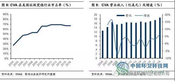 2004-2008年間,CVA快速崛起,市占率從27%提升至53%,成為美國垃圾焚燒發(fā)電市場的龍頭。2010-2016年這7年內(nèi)CVA一直維持著近70%的市占率。2016年,CVA年垃圾處理能力約2000萬噸,占全美總年處理能力比重達到67%。2016年底,CVA擁有與經(jīng)營45個垃圾焚燒發(fā)電廠,此外公司還有11個額外能源發(fā)電設(shè)施,包括木材生物質(zhì)與水力再生能源發(fā)電設(shè)施、18個轉(zhuǎn)運站、12個環(huán)境服務(wù)設(shè)施、1個區(qū)域金屬回收設(shè)施和4個垃圾填埋場。CVA的垃圾焚燒發(fā)電廠處理垃圾能力達到了5.5萬噸/日,年處理能力達到了2000萬噸,約占美國固廢年產(chǎn)生量8%,占美國年垃圾焚燒量的67%。