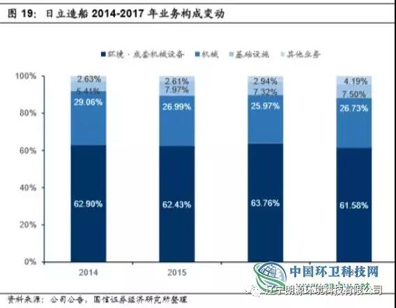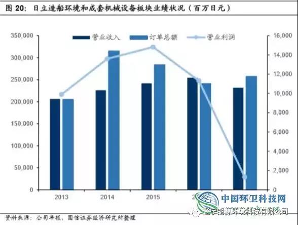 日立造船以環(huán)境和設(shè)備業(yè)務(wù)為主,公司堅持以制造為基礎(chǔ),向多個領(lǐng)域延伸發(fā)展,提供設(shè)施設(shè)備制造服務(wù)。公司業(yè)務(wù)由四部分組成:環(huán)境和成套機械設(shè)備、機械、基礎(chǔ)設(shè)施和其他,業(yè)務(wù)范圍廣。其中,環(huán)境和成套機械設(shè)備板塊占比基本維持在60%的水平,其次是機械板塊,占比在25%-30%之間。垃圾焚燒發(fā)電設(shè)施是環(huán)境和設(shè)備板塊的重要組成部分。近五年,環(huán)境和設(shè)備板塊的營業(yè)收入整體變動不大,增減幅在10%以內(nèi),但營業(yè)利潤波動較大,2015年達到峰值,營業(yè)利潤為148.19億日元,2016-2017年連續(xù)下降至13.16億日元,主要受公司訂單量減少影響。