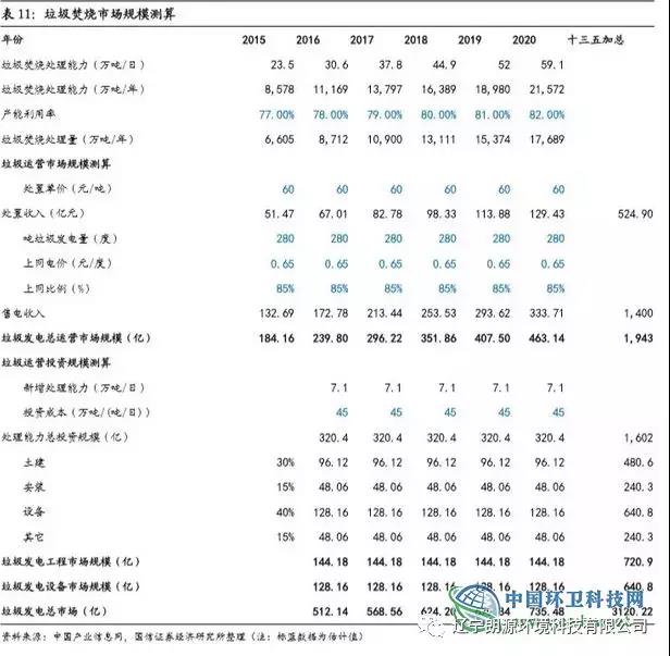 預(yù)計“十三五”期間,垃圾焚燒總市場規(guī)模達3120億?!丁笆濉比珖擎?zhèn)生活垃圾無害化處理設(shè)施建設(shè)規(guī)劃》提出,到2020年全國垃圾焚燒處理能力達到59.14萬噸/日,占無害化處理能力的比例達到54%。1)根據(jù)國家“十三五規(guī)劃”,假設(shè)2016-2020年每年新增7.1萬噸/日焚燒處理能力,項目產(chǎn)能利用率80%、噸垃圾處置費65元/噸、噸垃圾發(fā)電量280度、上網(wǎng)電價0.65元/度、上網(wǎng)比例85%,則垃圾焚燒發(fā)電運營市場規(guī)模將達到1450億。2)假設(shè)噸垃圾投資額40萬/(噸/日),則對應(yīng)2016-2020年每年垃圾焚燒總投資約285億。假設(shè)焚燒發(fā)電項目投資中,土建、安裝、設(shè)備及其它分別占總投資的比例為25%、13%、38%、24%,則2016-2020年垃圾發(fā)電工程市場規(guī)模為108億,設(shè)備市場規(guī)模為109億,十三五期間垃圾焚燒發(fā)電總工程就設(shè)備市場規(guī)模分別為542億、546億。綜合考慮工程、設(shè)備及運營市場,“十三五”期間垃圾焚燒總市場規(guī)模達到3120億。