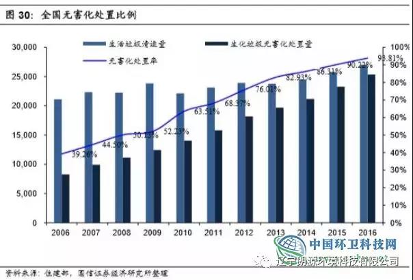 從生活垃圾無害化處置率來看,我國近十年城市生活垃圾清運量與無害化處理率穩(wěn)步上升。2016年,全國城鎮(zhèn)生活垃圾無害化處置能力約81.20萬噸/日,對應(yīng)年處理量2.53億噸,無害化處置率93.81%,其中設(shè)市城市96.62%,縣城85.22%。從處理量細分來看,2016年無害化處置中填埋、焚燒、其他方式年處置量分別為1.68億噸、0.80億噸、0.06億噸,占比分別為66%、31%和2%,衛(wèi)生填埋在無害化處置中占比******。